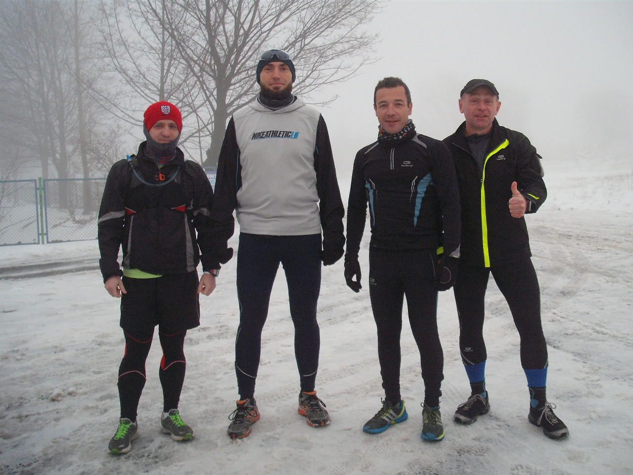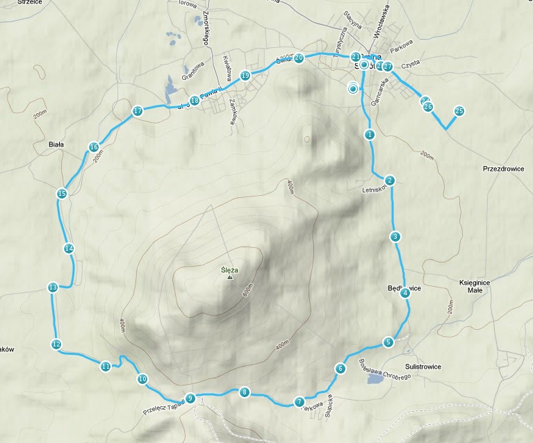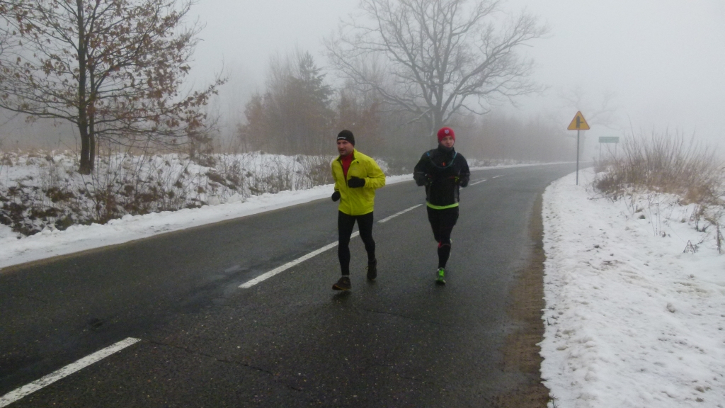 Na długie wybieganie, zaplanowaliśmy z Arturem i Sławkiem trasę Półmaratonu Ślężańskiego. Dobry pomysł, przy okazji zapoznam się z dróżkami, które będę pokonywał za miesiąc. Do Sobótki, gdzie był start, dojechaliśmy około godziny 7:30. Wolę długie wybiegania robić jak najwcześniej, żeby w ciągu dnia mieć czas dla rodzinki. Po paru minutach dołączyli do nas Grzesiek i jego hiszpański kolega Rafael. Ten ostatni ponoć uprawia triathlon i całkiem dobrze radzi sobie z bieganiem po górkach. 🙂 Bardzo szybko się o tym przekonaliśmy. Już po 3km podzieliliśmy się na dwie grupy. Z przodu pognali Artur, Sławek i Rafael, który narzucał dosyć mocne tempo, a z tyłu zaplanowanym rytmem biegłem ja i Grzesiek. Dziękuję mu za to, że postanowił mi towarzyszyć iście turystyczną szybkością. Niestety już na 7km stałem się ofiarą dwukilometrowego podbiegu, który mnie trochę pozamiatał. Musiałem się na chwilę zatrzymać, żeby dojść do siebie. Tempo nie było oszałamiające, żebym czuł się taki wypluty, tym bardziej na początku naszego treningu. Cóż, trudno…całe szczęście później było długo w dół z kilkoma krótkimi „hopkami”. Kiedy dobiegaliśmy do sali, w której organizator półmaratonu przygotował dla zawodników szatnie i gorącą herbatę z miętą, odczuwałem niepokojący ból prawej strony biodra. Dołączyliśmy do kolegów w szatni i zastanawiałem się czy dam radę dobiegać 10km do zaplanowanych na niedzielę 32km. Chwilę ponaciągałem łydki i stwierdziłem, że spróbuję. Jeśli bym tego nie zrobił, Artur sam by się wybrał…już i tak śmiał się, że marudzę i sam sobie jestem winien bo mało biegam, a później widzi, że tu czy tam trening opuszczony. Pewnie jest w tym trochę racji. Jak się nie dokańcza długich wybiegań, to dziwne żeby mieć wydolność na przyzwoitym poziomie. Sławek postanowił, że nie będzie siedział i pobiegnie z nami. Myślę, że trochę źle zrobiłem decydując się na wyjście na trasę. Po 4km biodro bolało przy każdym kroku, jakby ktoś wbijał mi szpilę od dołu. Zamiast 10km dorobiłem w bólu 5,5… Trening zakończyłem z dorobkiem 27,5km, ale tym razem nie będę marudził, że się coś nie udało….przeciwnie wypad na pół maratońską trasę udał się w całej rozciągłości, teraz już wiem co 23 marca będzie mnie czekało.