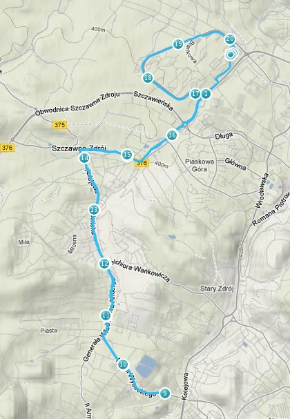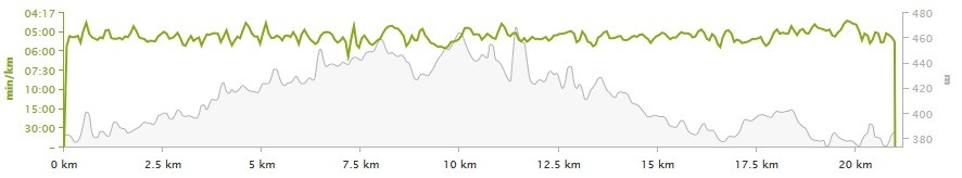 Długie wybieganie początkowo planowałem na sobotę z Arturem po płaskich (jak na nasze warunki) Świebodzickim terenie, ale nic z tego nie wyszło ponieważ Szymonek miał testy sprawnościowe do pierwszej klasy o profilu piłkarsko-lekkoatletycznym. Później się okazało, że jednak się nie dostał. :/ Na trening poszedłem w niedzielę ok. godziny 8, żeby mieć później czas na śledzenie poczynań kolegów, którzy brali udział w maratonach w Wiedniu i Łodzi. Plan zakładał 21km w tempie maratońskim (5:20/km). Nie bawiłem się w wynajdywanie ciekawej trasy, tylko pobiegłem wzdłuż ulic do centrum miasta, co dało 9km i z powrotem tyle samo, a to co mi zostało do dystansu dokręciłem między blokami. 🙂 Profil trasy, co widać na załączonym screenie, nie był płaski i mam nadzieję, że podbiegi nie pójdą na marne. 🙂 Strasznie nie lubię tego kręcenia się koło bloków, żeby dobić dystans, a uzbierało się tego prawie 2km. Trening zakończyłem z tempem 5:14/km. Fajny prognostyk, pytanie tylko czy uda mi się utrzymać tempo na dystansie 42km?