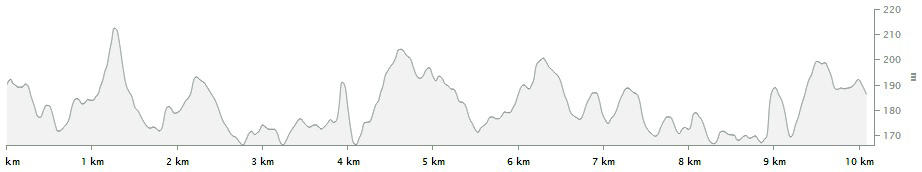 Ruszyliśmy. Na początku niestety musieliśmy się przedzierać, trochę nie trafiona była nasza wyjściowa pozycja. Pierwsze kilkaset metrów prowadziła Magda, a my ze Sławkiem próbowaliśmy przedzierać się przez tłum, żeby nie stracić jej z oczy….przynajmniej ja:). Kiedy tak się rozkręciłem w wymijaniu (wyprzedziłem Magdę) przez chwilę starałem się pilnować mojej grupy odwracając się i kontrolując dystans, ale szybko zorientowałem się, że nie ma to sensu. Postanowiłem biec sam, cały czas wyprzedzając. Już po ok. 600m trasy zaczął się podbieg, najpierw łagodny, żeby na końcówce zagiąć się trochę do góry. 🙂 Po profilu widać, że na 600m jest ok. 50m pozytywnego przewyższenia. Był to jeden z dwóch podbiegów na pętli, które w zeszłym roku dały mi w kość, teraz wciągnąłem go jak długą prostą. 😉 Tempo na pierwszym kaemie, uwzględniając tłum na starcie i część podbiegu to 5:03/km i uznałem to jako dobry prognostyk na dalszą podróż. Po wdrapaniu się na górkę była kilometrowa prosta w dół do jeziorka, czy zalewu…zbiornika wodnego. Na tym odcinku przyśpieszyłem do 4:50/km. Trasa wiodła dookoła tego stawu i w połowie tego okrążenia był punkt pomiarowy (2,5km) na którym zameldowałem się z czasem 11:09 plasując się na 712 miejscu. Po drugiej stronie wody przyczaił się nasz kolega Krzysiek Wajerowski, który postanowił robić zdjęcia, ale niestety za późno mu pomachałem i zdążył tylko krzyknąć, że jestem za szybki. 😉 Kolejne dwa kilometry cały czas przyśpieszałem i przy okazji wyprzedzałem (3km 4:46/km i 4km 4:36/km). Obawiałem się trochę co to będzie na drugim podbiegu, który ma ok. 10% pochylenia. Na pierwszym okrążeniu nie było tragedii, trochę się zasapałem, ale starałem się jak najmniej zwalniać. Udało mi się 5km, który zawierał tą górkę i w drugiej części zbieg do pomiaru, pokonać w 4:57/km i to był dla mnie sygnał, że nie biegnę ot tak sobie rekreacyjnie, tylko jest szansa na osiągnięcie dobrego czasu.